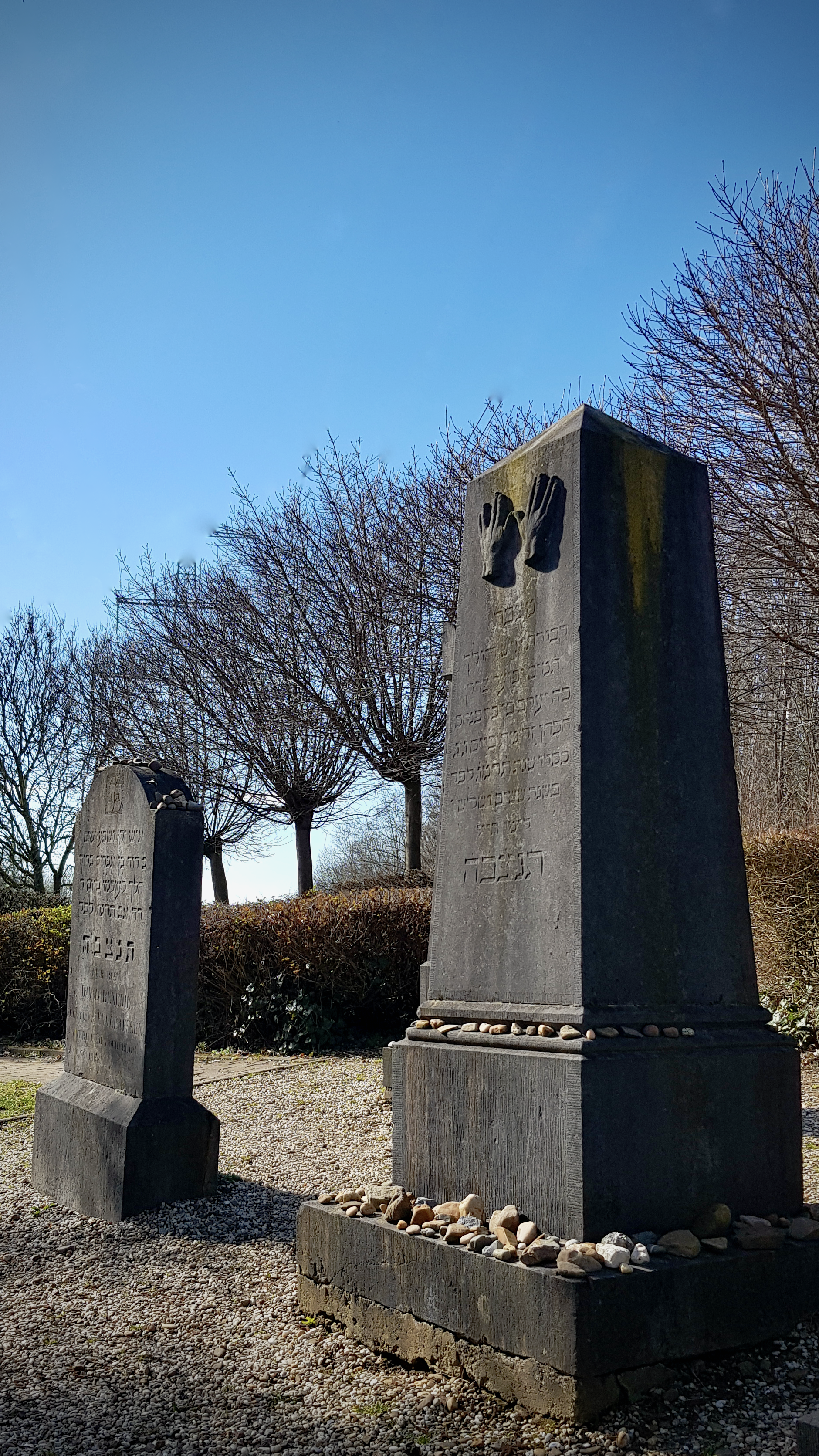 In Groot-Haasdal, op de Kleverberg ligt de kleinste begraafplaats die ik tot nu toe zag, slechts vier (Joodse) graven. Ooit waren dat er zeven. De graven dateren van eind 19e, begin 20e eeuw en op een aantal ervan vind je tekst in het Hebreeuws en het Nederlands. De begraafplaats is kennelijk privébezit geweest, wat het geringe aantal graven verklaart. Op de foto zie je een grafsteen met een afbeelding van zegenende handen, de naam Caen of Caan stam af van Cohen, wat priester betekent in het Hebreeuws.